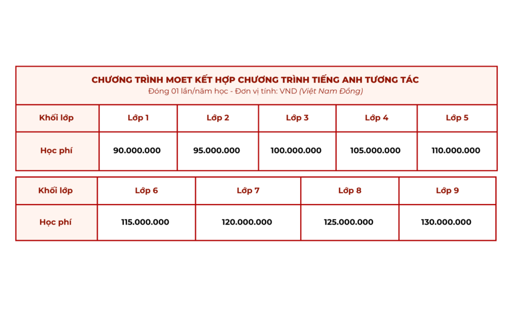 Phí ăn bao gồm 2 bữa/ngày: Ăn trưa và Ăn xế. Tiểu học: 80.000 VND/học sinh/ngày. THCS: 120.000 VND/học sinh/ngày.